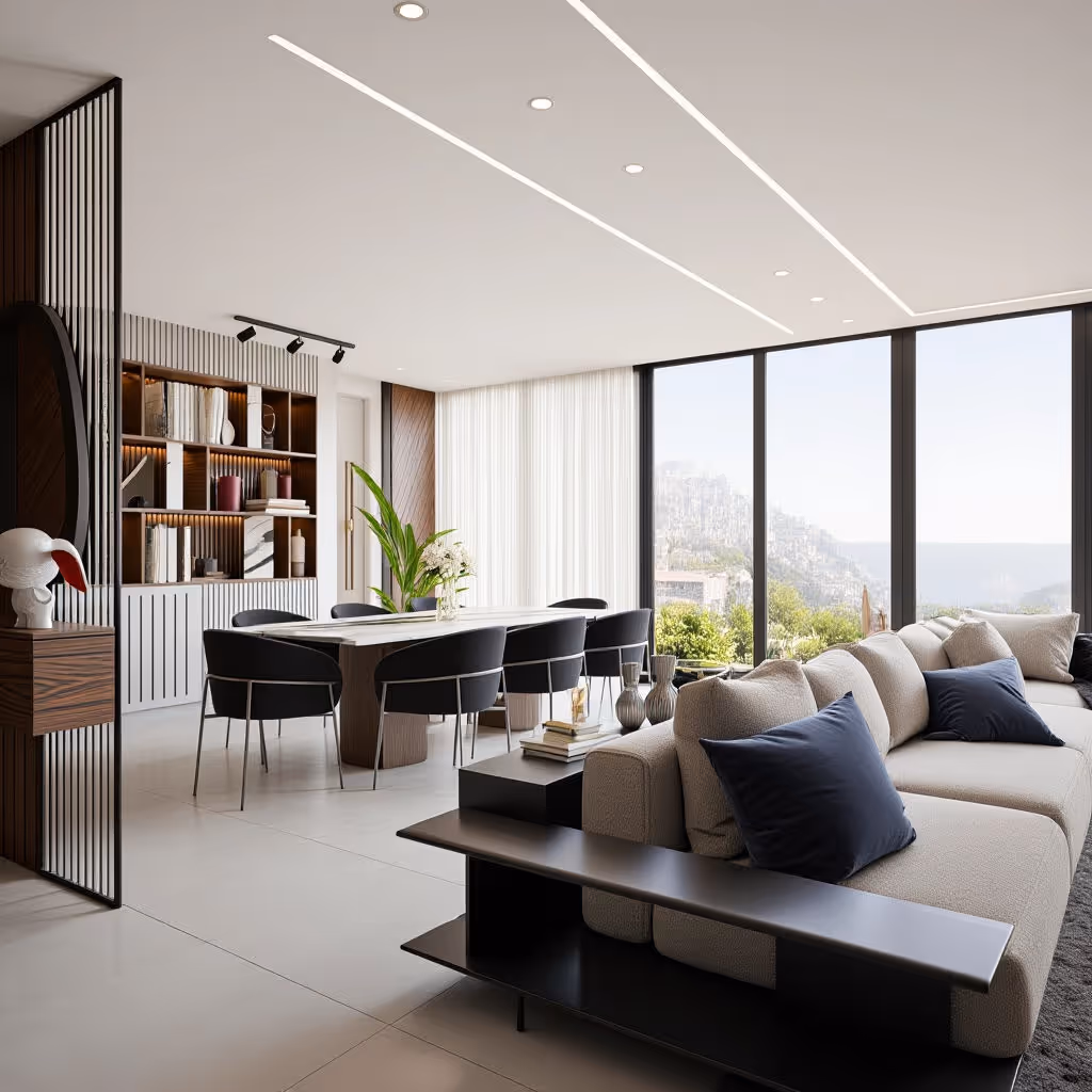 This villa project in Fatka features a contemporary open-space interior designed to seamlessly connect living, dining, and circulation areas. Warm walnut wood, marble accents, and clean white surfaces define the material palette, creating a refined balance between modern luxury and everyday functionality. Floor-to-ceiling glazing and layered lighting enhance spatial continuity and natural light, resulting in a bright and elegant living environment.