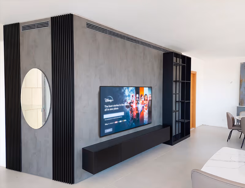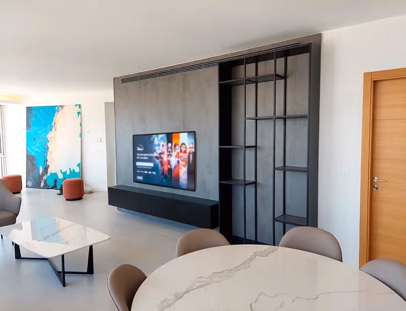 This living room in Verdun was designed to create a bright, calming, and joyful atmosphere. GM Concepts embraced a simple contemporary design featuring white walls, a wraparound window with a screen, and soft neutral tones that enhance both luxury and comfort.