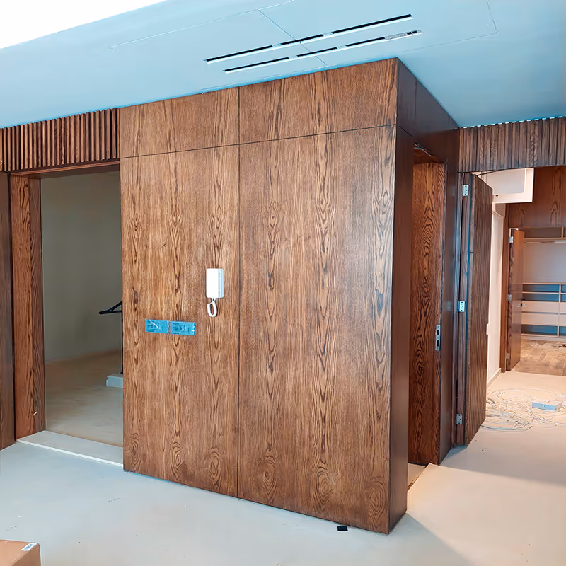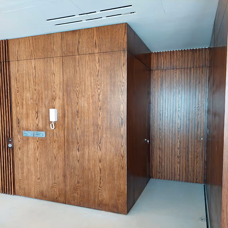 This modern bathroom in Broumana was designed to create the illusion of a larger, more open space. Floor-to-ceiling timber cladding walls with hidden doors deliver a seamless, minimalist aesthetic while enhancing spatial continuity.