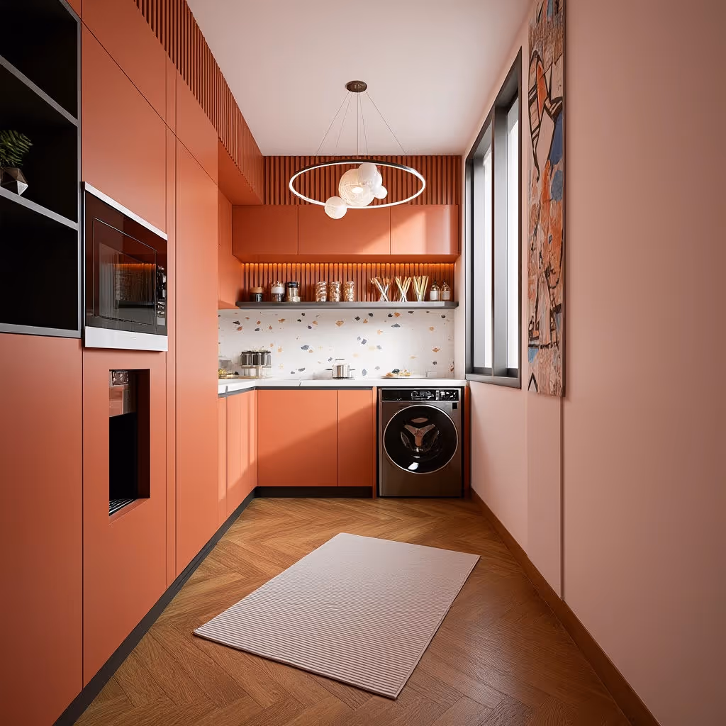 This compact apartment in Ain Saade was designed with a smart modern interior concept that optimizes every square meter without compromising comfort or elegance. Curved custom cabinetry, warm terracotta accents, and natural wood flooring create a cozy yet refined atmosphere, while soft lighting enhances visual openness throughout the space.