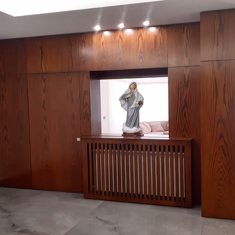 By enhancing thermal insulation and selecting region-appropriate materials, the design integrates comfort with elegance. High-density fiberboard with oak veneer and walnut-toned finishes, ceramic tiles for the fireplace, and solid wood radiator covers were carefully chosen to ensure both durability and visual warmth.